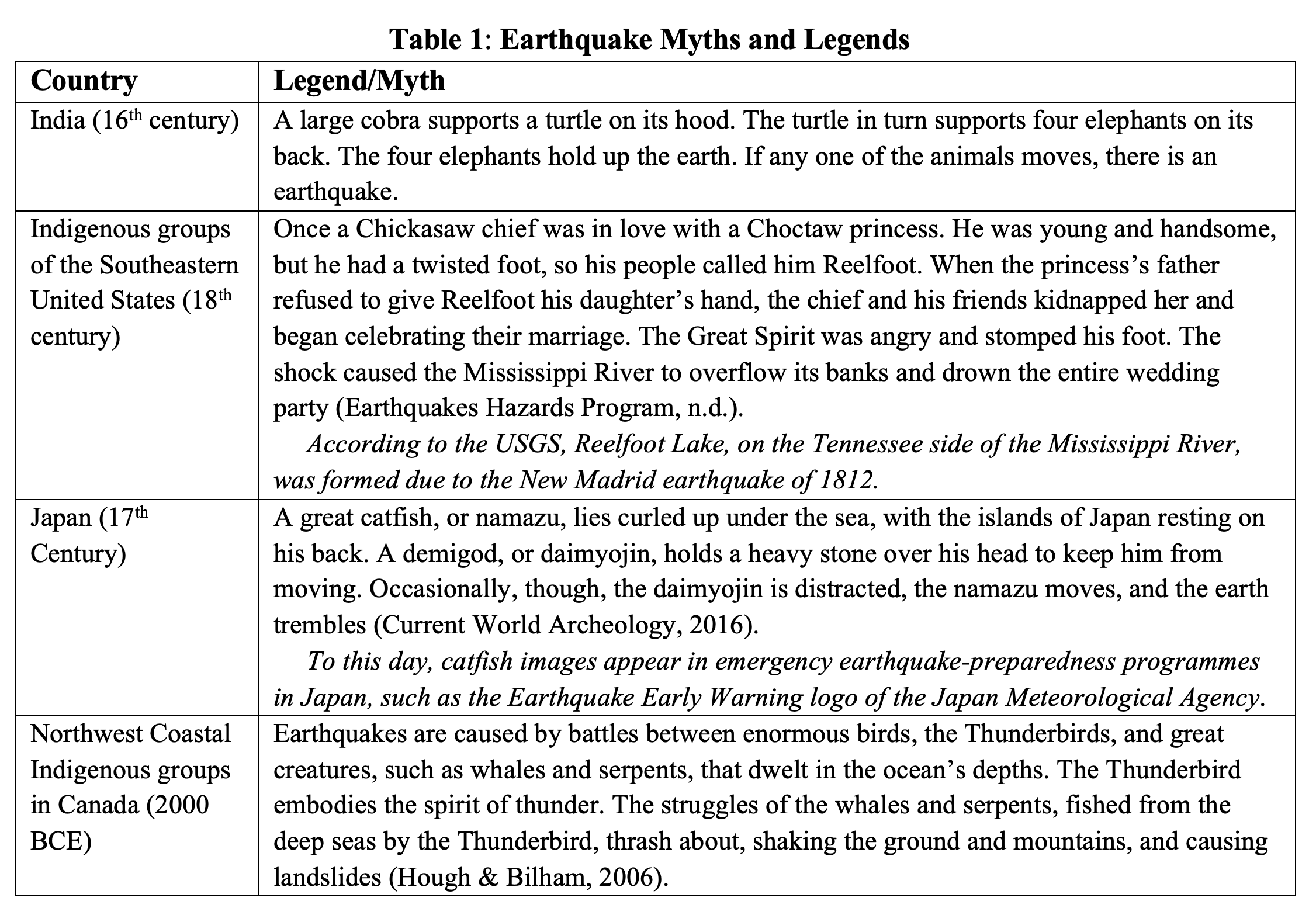 In the ancient past, many cultures experienced disastrous “ground-shaking” events of unknown cause, but their effects were clear. The deadliest earthquake on record happened in China and claimed almost one million lives. In the winter of January 23, 1556, an earthquake struck Shaanxi province, China, causing mountains and rivers to change positions; new hills and valleys were formed, huts, temples and city walls collapsed, and with them 830,000 human deaths occurred (Carter, 2023). Thus, peoples of the past looked for ways to explain these natural phenomena. One strategy was through developing stories, what we now typically call myths, as shown in Table 1. These tales were relayed by word of mouth, a common means for knowledge dissemination in centuries past.