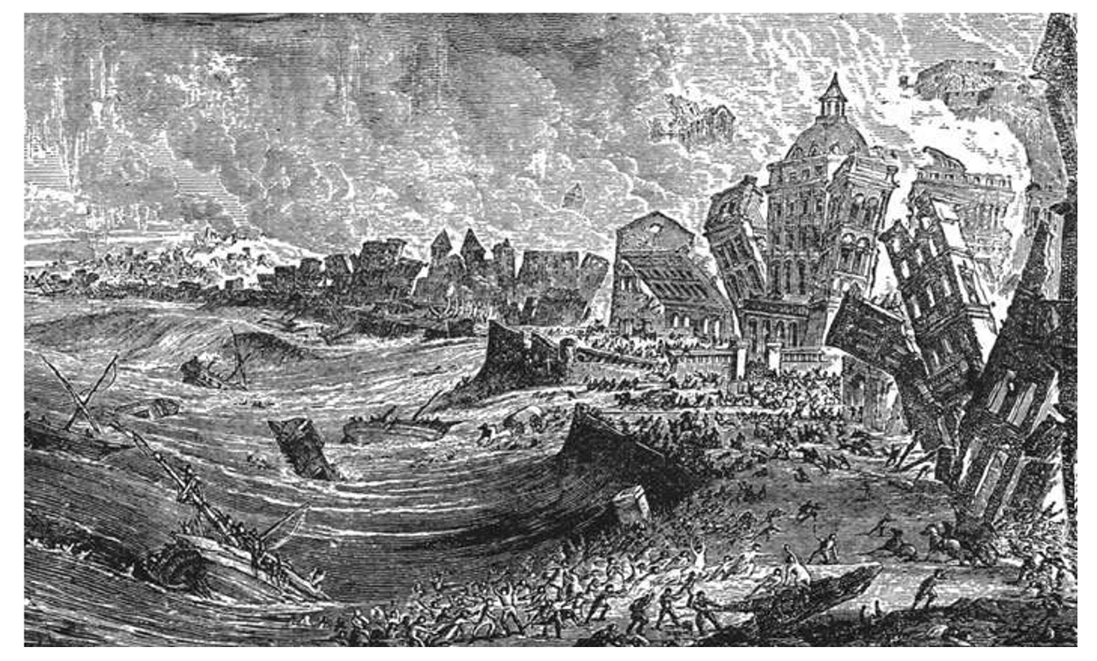 Hough and Bilham (2006) provide an effective account of this devastating earthquake, which struck in Lisbon, Portugal on All Saint’s Day, November 1, 1755. They draw on the remarks of the witness Reverend Charles Davy, who described what he observed and how it felt. He was in his apartment preparing for Mass that bright Sunday morning, when he felt a gentle motion that grew to a trembling of the house some time between 9:00 and 10:00 a.m. He initially attributed it to the rattling of several coaches in the main street, but a frightful underground noise soon followed the initial rattling. Shortly thereafter, he heard a horrible crash, as if every structure in the city had just tumbled down at once. His apartment building shook so violently that the upper stories above him immediately fell. Though his apartment on the first floor did not share the same fate, everything was thrown out of its place. Going outside, he witnessed the tremendous destruction of his home and city, a disturbing sight for him and many others who gathered in the streets. But another great rumble was on the way. The following quote from Eva March Tappan (1914) vividly puts into words Davy’s feelings about what was happening—that things could not get any worse, until he heard someone shout that the ocean was coming in: