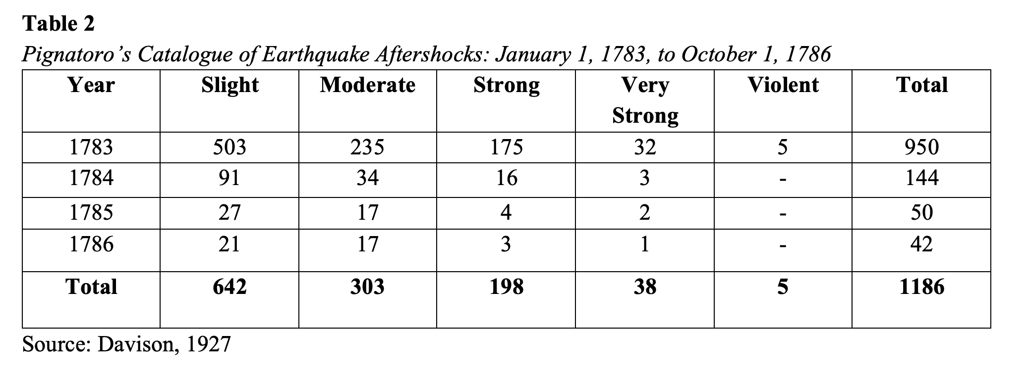 One investigator, Domenico Pignataro (1735–1802) of Monteleone, wrote the first article on the Calabrian earthquake and catalogued earthquake shocks during a period from January 1, 1783, to October 1, 1786 (Davison, 1927). Not only did he give the times of the 1,186 shocks, but he assigned to each a categorization in the form of a scale. This rough scale has five degrees (F’, F’’, F’’’, F’’’’ and F’’’’’) and is the earliest known attempt to construct a scale of earthquake shaking. He classified the shocks as slight, moderate, strong, very strong, and violent, denoting the “Force” of the earthquake (Table 2). Pignataro’s scale is thus one of the earliest expressions of a scale that describes the force of earthquakes as felt by witnesses.