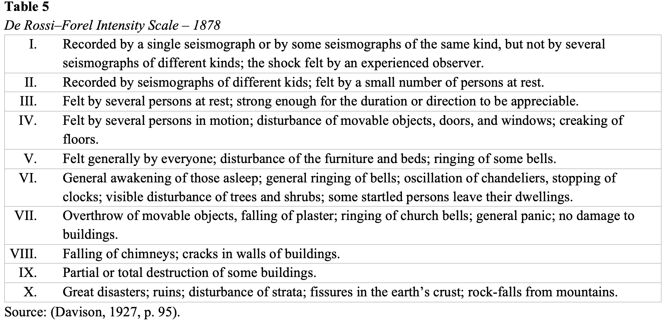 Meanwhile, in Switzerland, outside of Rossi’s knowledge and influence, limnologist François-Alphonse Forel (1841–1912) developed a similar seismic scale. When the two scientists became aware of each other’s work, their combined effort resulted in the De Rossi–Forel scale for determining the intensity of earthquakes, shown in Table 5 (Davison, 1927). De Rossi and Forel, however, were not the only ones developing scales to describe earthquakes in this manner, as we get to below.