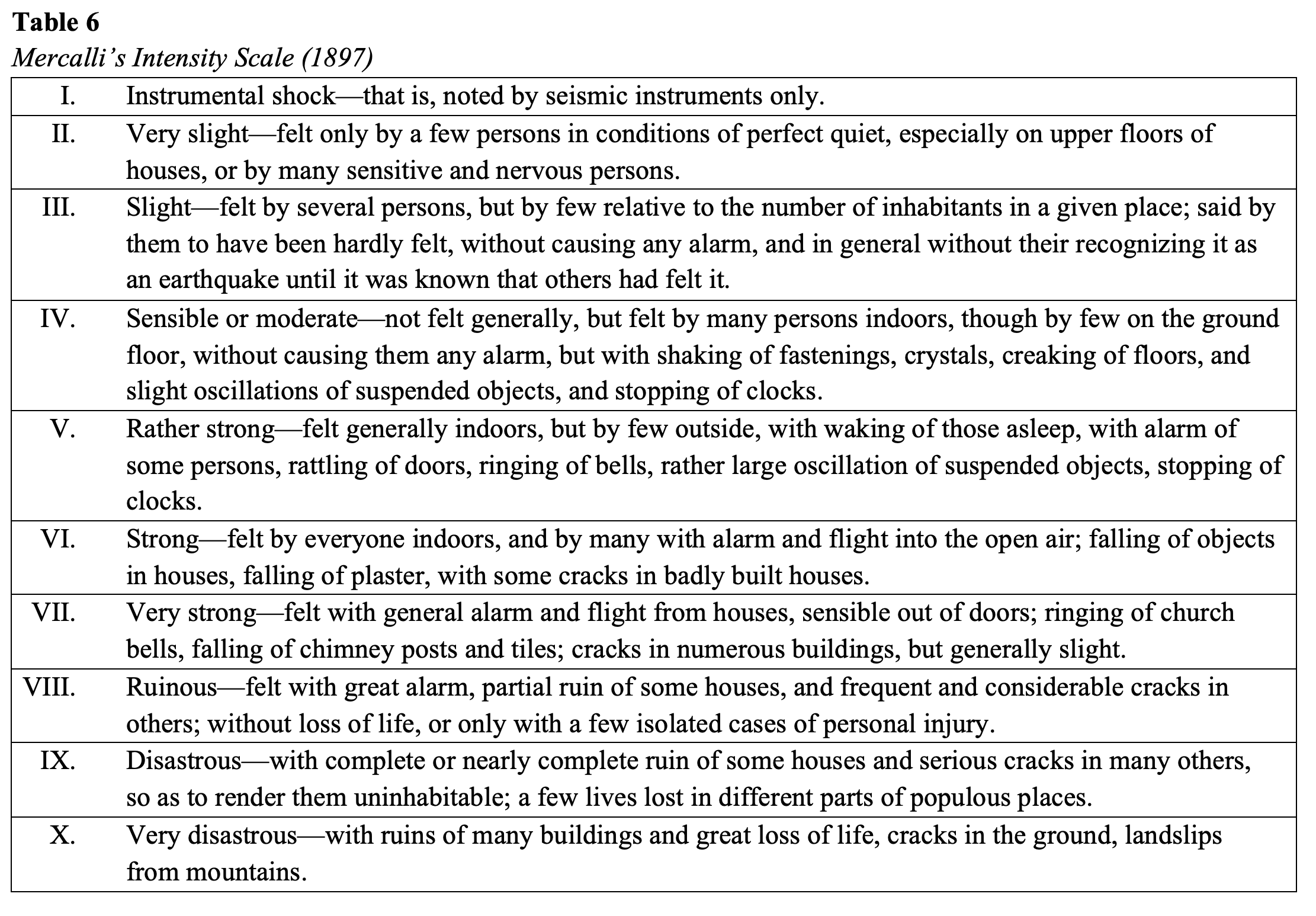 In 1883, Mercalli published his remarkable work, The Phenomena of Volcanoes in Italy [Vulcani e fenomeni vulcanici in Italia], with the first part (pp. 1–215) on volcanoes and the second part (pp. 216–367) devoted to the earthquakes and their distribution in time and space. The catalogue of Italian earthquakes (pp. 219–332) was one of the earliest and most successful attempts to chronicle the earthquakes of Italy as a whole, from 1450 BCE to 1881 CE. As an earthquake investigator, Mercalli soon realized the usefulness of the De-Rossi-Forel intensity scale in describing the effects of earthquake damage (Davison, 1927). In 1887, while studying the Riviera earthquake, Mercalli determined that the higher degrees of Rossi-Forel scale were insufficient to discriminate various amounts of damage. He modified the scale and proposed a final form in 1897, which is shown in Table 6, which was designed for use in countries experiencing strong earthquakes. This scale perhaps sparked the idea of different regional intensity scales that were about to emerge, based on different geologies in the world. This scale was subsequently adopted by the Central Office of Metrology and Geodynamics in Rome.