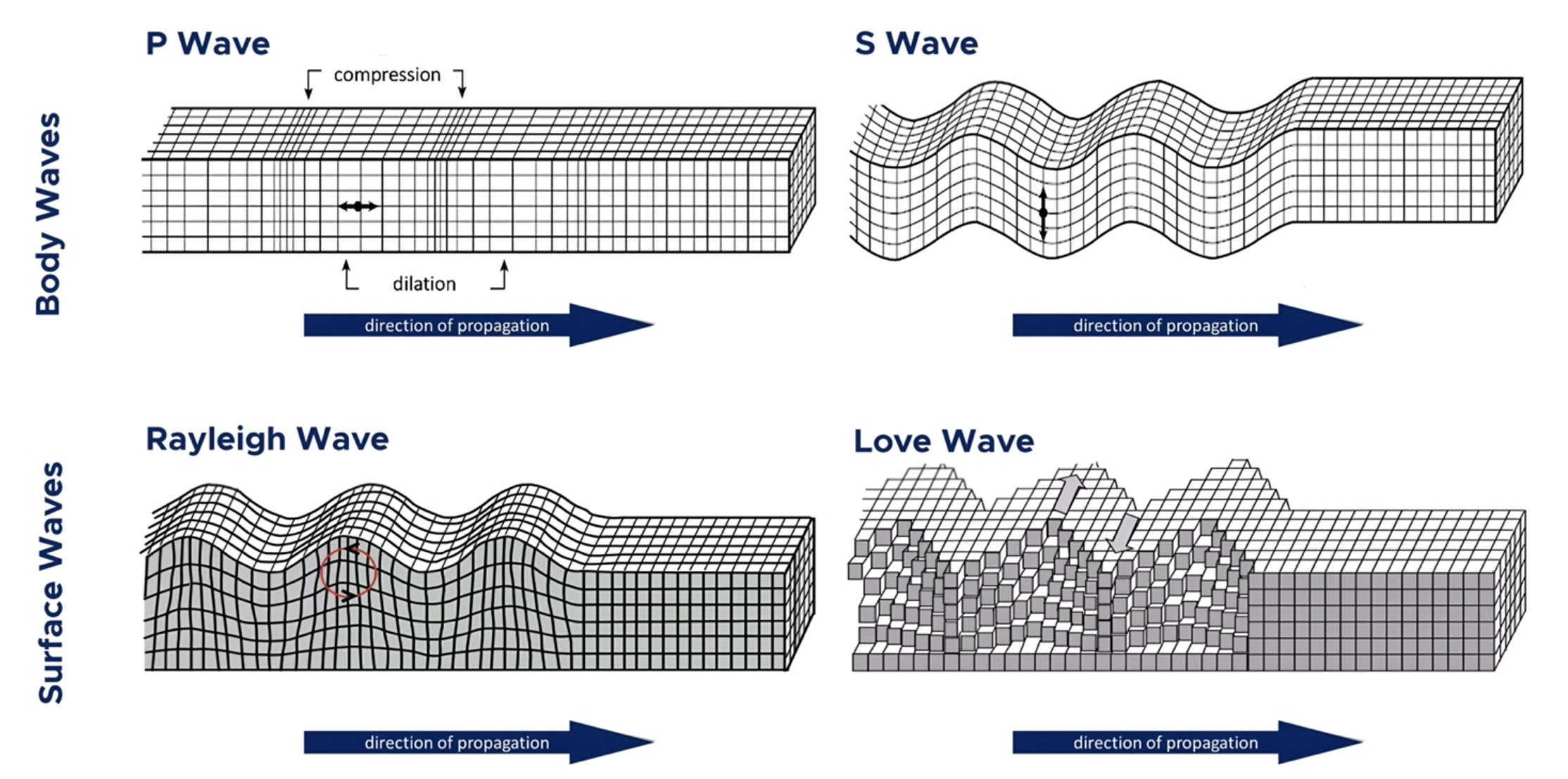 A practical engineer of Dublin and later of London, Mallet discussed earthquake waves in classical mechanics by drawing parallels between the earthquake waves and sound waves. His experiments and discoveries made a significant contribution to this field, inspiring future thinkers, such as Richard Oldham (1858–1936), who was the first to provide clear evidence for P-waves, S-waves, and surface waves in earthquakes in his landmark 1906 report on the 1897 Assam, India, earthquake (Oldham, 1906). Others would also designate new kinds of seismic waves: In 1855, Lord Rayleigh (1855), predicted the existence of surface waves that roll along the ground,; in 1911, Augustus Edward Hough Love (1911) demonstrated the existence of certain surface seismic waves, that cause horizontal shifting of the earth during an earthquake in 1911. All these wave patterns are shown in Figure 7.
