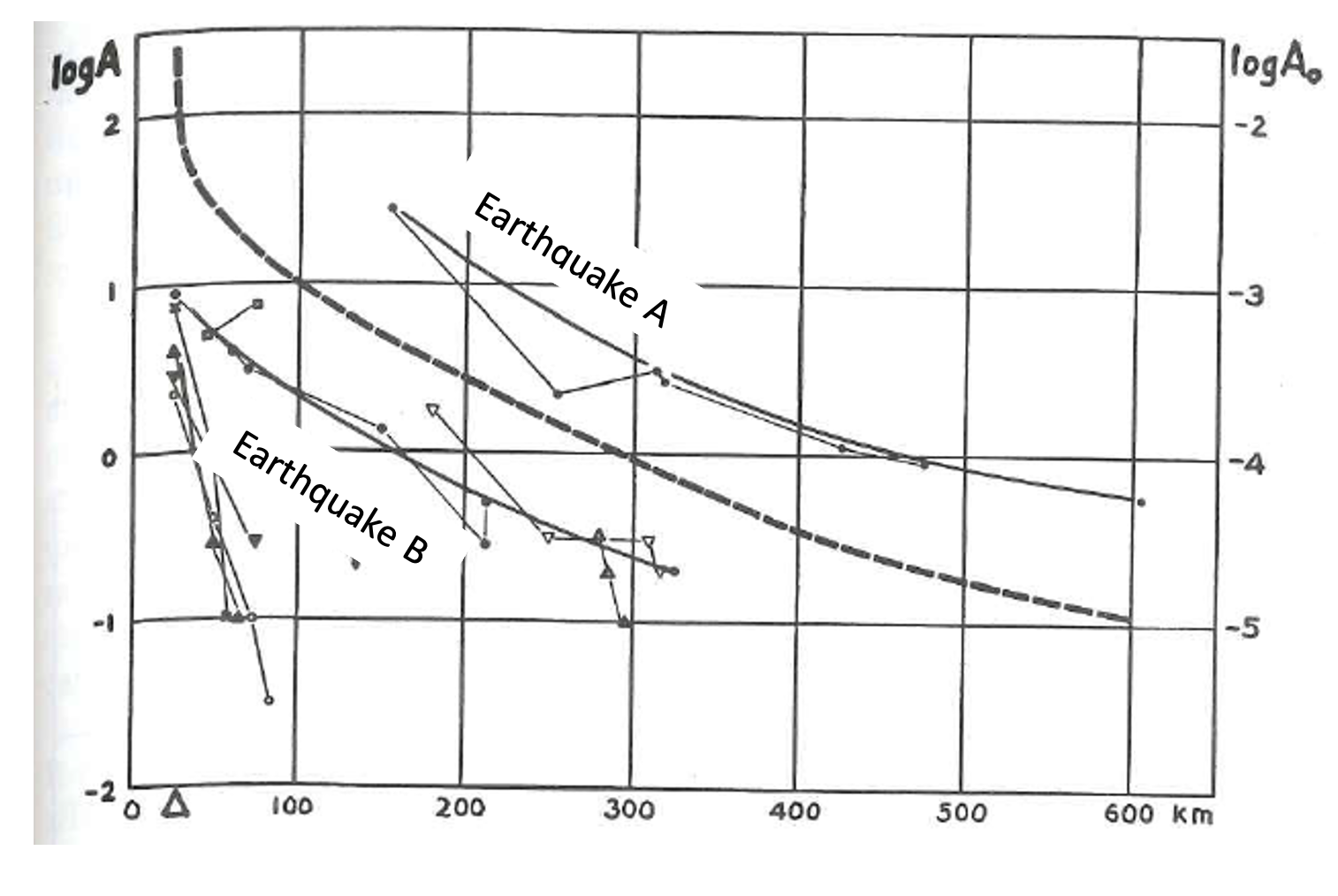 Controlling for as many variables as possible, Richter began documenting amplitude records of southern California earthquakes, including their distance from each seismic station. He considered two earthquakes—earthquake A and earthquake B, as shown in Figure 9—which had the exact same source distance and were recorded at the same stations. He assumed that the larger earthquake should record larger seismograms than the smaller one at any one station. If the epicentres differed, the smaller shock could appear as a larger seismogram at given station if it was markedly closer to it. Accordingly, the general procedure was first to determine the epicentre for each shock. Then he would plot the maximum ground motion at each station, as aligned with the corresponding epicentral distance from each of the recording stations; this amplitude would decrease with distance from the epicentre. By plotting the two curves for different earthquakes, one curve will likely be higher than the other, indicating that it was the larger event. This is evident in Figure 9.