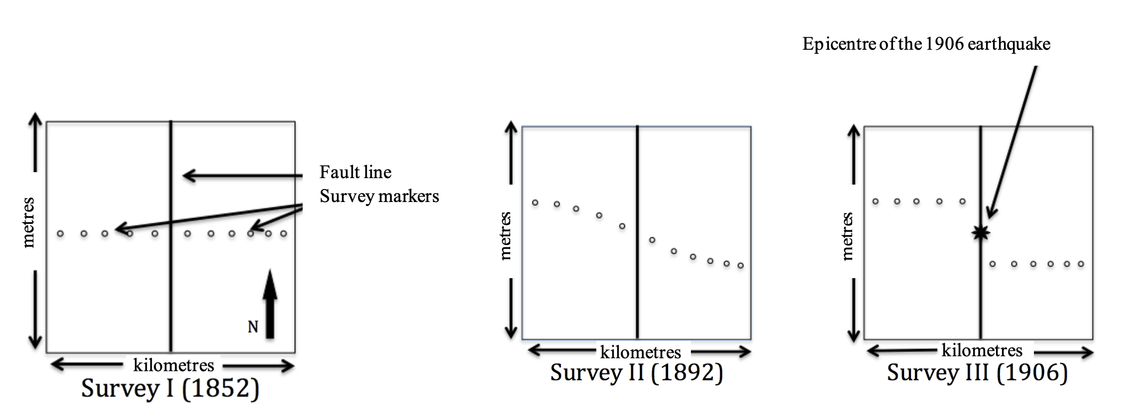 Harry Reid was part of the group commissioned by the governor of California to study the effects of this 1906 earthquake, which almost destroyed San Francisco as well as many other towns along the 200-mile rip in the crust. Significantly, he used his previous experiences with glaciology and the movements of glaciers to begin developing an explanation for this earthquake. Reid looked at three survey events in the area, collected during the decades prior to the 1906 event: I – 1852 to 1865; II – 1874 to 1892; and III – 1906, depicted in Figure 10.Based on these data sets, Reid (1910) made several claims: