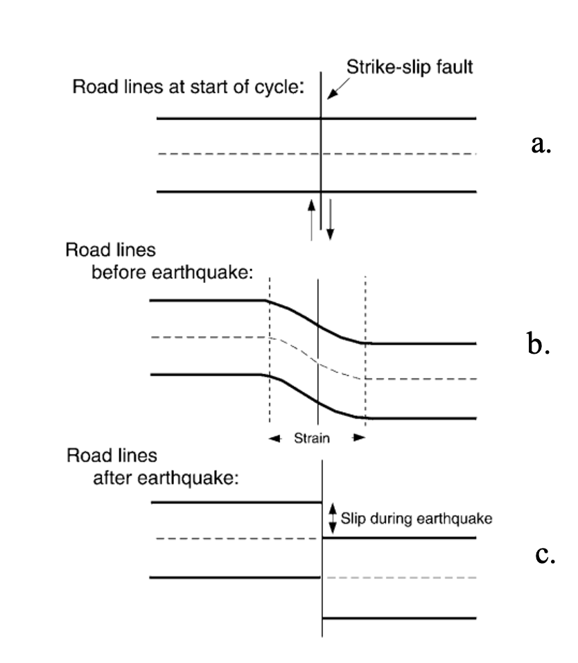 Figure 11 shows how Reid (1910) interpreted the data: (a) He assumed a time when no displacement existed across the fault; (b) A horizontal displacement occurred from through the time of each of the surveys. West of the fault was moving in a northerly direction, and east of the fault was moving in a relatively southern direction. However, during this time there was no actual displacement along the fault. Instead, strain gradually built up, resulting in a deformation, much like the bending of a large stick that will bend back once the stress is removed. (c) Eventually, the strain build-up was too much for the strength of the rock and the rock broke along the fault. When this happened, the energy in the rock, stored as strain, was released as the rocks elastically returned to their normal, unstrained structure.